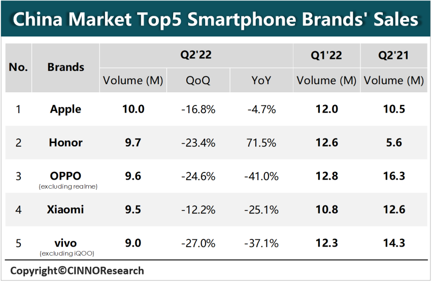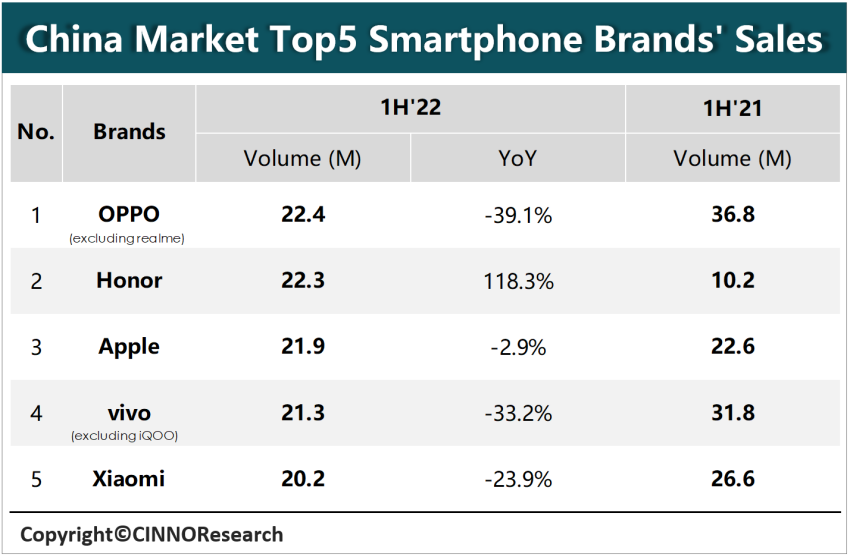 CINNO:2022 年上半年中国市场智能机销量同比下降 16.9%