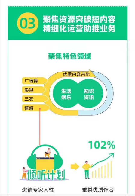 经过活跃的运营战略,趣头条App聚集日子文娱、常识资讯两大方向,在广场舞、影视、三农、情感、故事等特征范畴继续发力,进步优质内容占比。如在情感范畴,趣头条App深度发掘新式商场用户在情感方面的内容需求,推出“倾听方案”,约请数十位闻名情感专家,打造“情感帮帮团”,在线回答用户关怀的情感问题,构成风趣头条特征且专业的情感协作系统。仅在一周时刻内,该活动拉动情感垂类优质作者数增加102%。