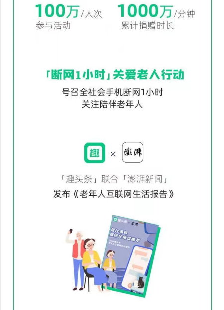 关于数量巨大又缺少注重的老年人集体,趣头条特别注重。在重阳佳节,趣头条发布了《老年人互联网日子陈述》,初次披露了渠道百万60岁以上老年人网络习气和偏好,并推出“断网1小时”关爱举动,呼吁全社会“放下手机1小时”,陪同和关爱身边的白叟。此外,趣头条和我国扶贫基金会达到协作,出资助力村庄白叟安心养老,一起联合微医、善诊等专业组织,为白叟供给心思协助和免费体检卡,以实际举动呵护白叟身心健康。活动上线三天时刻,累计取得1亿人次注重,有近百万人次参加互动。