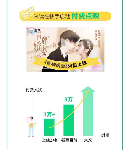 近期,米读在IP孵化上再次立异。米读在快手上首播的原创短剧发动了付费点映服务,原创著作《冒牌娇妻》在24小时付费人次过万,到现在,该剧付费人次已挨近3万。
