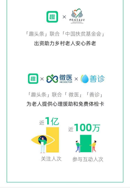 7月,趣头条建议“热流举动”,在未来一年内供给价值1亿元的渠道流量,扶持公益广告、宣扬公益项目,该举动估计掩盖1.38亿移动互联网用户,其间包含9660万新式商场用户。