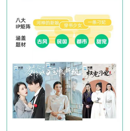 在建造作者生态的一起,米读也在活跃开辟IP孵化新模式。本年9月,米读和快手达到独家战略协作,米读将渠道上抢手小说孵化成短剧IP,并在快手独播。到现在,米读已在快手上建立了《河神的新娘》、《穿书少女》、《一条刁妃》等八大内容IP矩阵,包含古风、民国、都市、甜宠等多种体裁。现在,米读在快手上的短剧账号总粉丝量已破千万,全网总播放量打破14亿,单集播放量最高明5000万,集均播放量也高达500万。