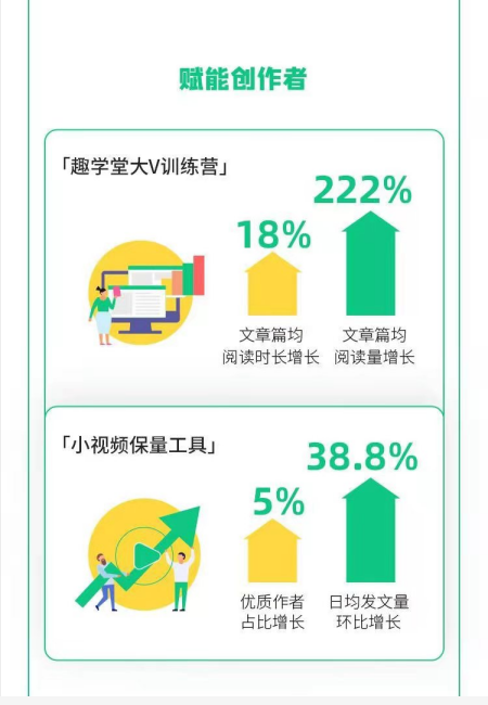 一起,针对渠道创作者,趣头条展开了趣书院大V训练营,并推出小视频保量东西扶持头部KOL,协助创作者由粗豪化运营向精细化运营改变。在三周时刻内,参加大V训练营作者的文章篇均阅览量进步222%,篇均阅览时长增加18%,小视频优质作者占比进步5%,小视频日均发文量环比增加38.8%。