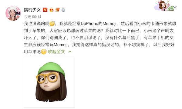 ,Mimoji 萌拍形象 “没有对其他友商包含苹果进行任何抄袭”。小米称 Memoji 米萌应用于 2018 年 5 月 31 日随小米 8 通明探究版一起发布,而且对其进行进一步功用晋级,已确定将应用在行将发布的小米 CC9 系列上。该公司一起期望 @搞机少女 供给 iPhone 对照组内容来历来便利其进行内部再检查。“小米公司高度尊重知识产权,此前现已在公司内部确认了对抄袭行为零忍受的情绪。” 小米在声明中表明。