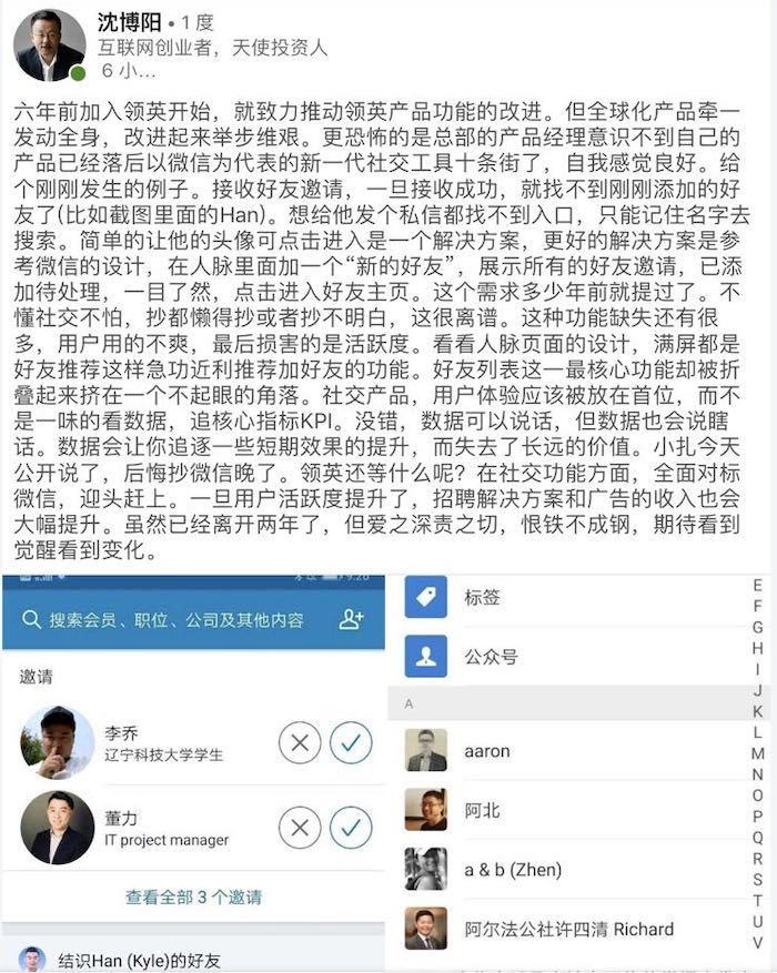 六年前参加领英开端,就努力推进领英产品功用的改善。但全球化产品牵一发起全身,改善起来寸步难行。更恐惧的是总部的产品司理认识不到自己的产品现已落后以微信为代表的新一代交际东西十条街了,自我感觉良好。给个刚刚产生的比方。接纳老友约请,一旦接纳成功,就找不到刚刚增加的老友了(比方截图里边的Han)。想给他发个私信都找不到进口,只能记住姓名去查找。简略的让他的头像可点击进入是一个解决方案,更好的解决方案是参阅微信的规划,在人脉里边加一个“新的老友”,展现一切的老友约请,已增加待处理,一望而知,点击进入老友主页。这个需求多少年前就提过了。不明白交际不怕,抄都懒得抄或许抄不明白,这很离谱。这种功用缺失还有许多,用户用的不爽,最终危害的是活跃度。看看人脉页面的规划,满屏都是老友引荐这样急于求成引荐加老友的功用。老友列表这一最中心功用却被折叠起来挤在一个不起眼的旮旯。交际产品,用户体会应该被放在首位,而不是一味的看数据,追中心目标KPI。没错,数据能够说话,但数据也会说瞎话。数据会让你追逐一些短期作用的提高,而失去了久远的价值。小扎今日揭露说了,懊悔抄微信晚了。领英还等什么呢?在交际功用方面,全面临标微信,迎头赶上。一旦用户活跃度提高了,招聘解决方案和广告的收入也会大幅提高。尽管现已脱离两年了,但爱之深责之切,恨铁不成钢,等待看到觉悟看到改变。