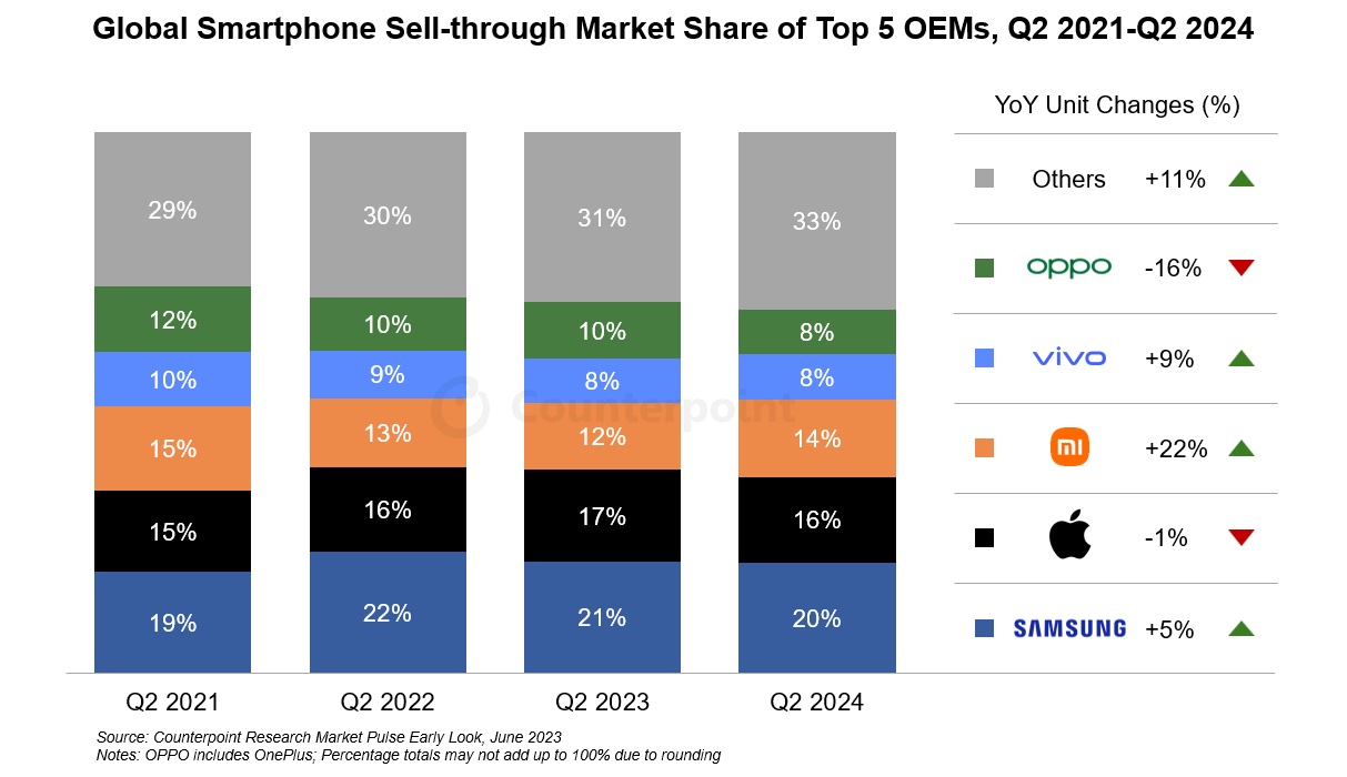 Counterpoint:全球智能手机市场在 2024 年第二季度同比增长 6%