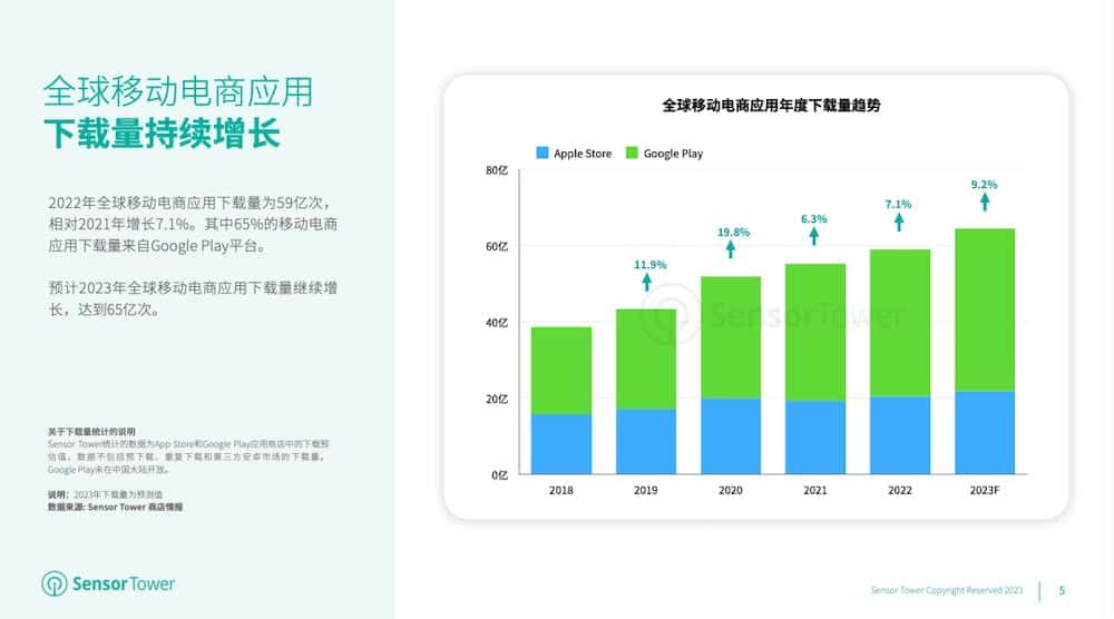依据Sensor Tower发布的最新陈述,跟着电子商务在全球不同商场的遍及,2022年全球移动电商使用下载量到达59亿次,比较2021年增加7.1%。以下为具体内容: