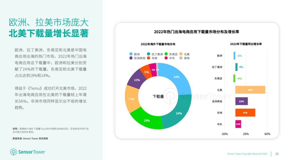 欧洲、拉丁美洲、东南亚和北美成为我国电商使用出海的抢手商场,2022年抢手出海电商使用总下载量中,别离有24%、24%、19%和14%的下载量来自以上商场。《Temu》在北美商场的快速走红,使得2022年出海电商使用在该商场的下载量环比增加56%。