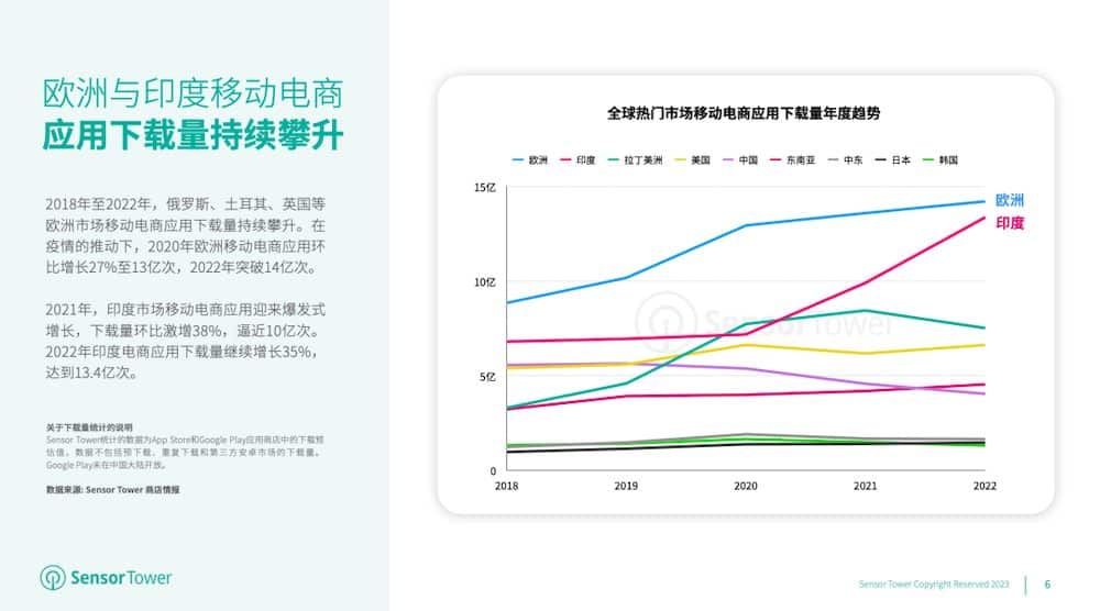 2018年至2022年,欧洲商场移动电商使用下载量继续攀升,其间2020年欧洲电商使用环比增加27%至13亿次,2022年下载量已打破14亿次。印度商场移动电商使用在2021年爆发式增加38%至10亿次,2022年印度电商使用下载量增加35%到达13.4亿次。