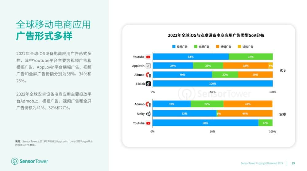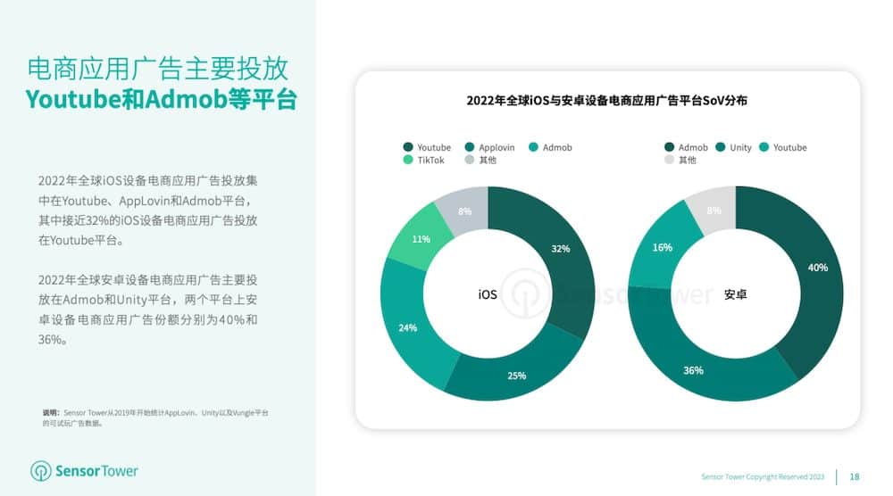 2022年,Youtube和Admob成为全球电商使用广告的重要投进渠道,其间挨近32%的iOS设备电商使用广告投进在Youtube渠道,40%的安卓设备电商使用广告投进在Admob渠道。