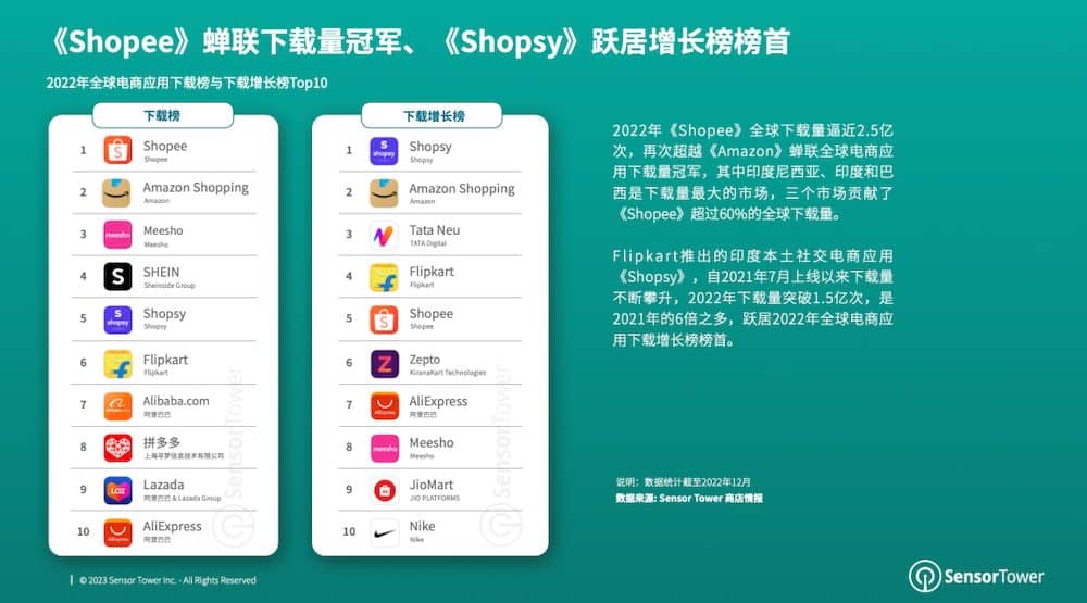 2022年,东南亚电商使用《Shopee》以近2.5亿次下载量,再次逾越《Amazon》连任全球电商使用下载冠军,其间印度尼西亚、印度和巴西是下载量最大的商场。