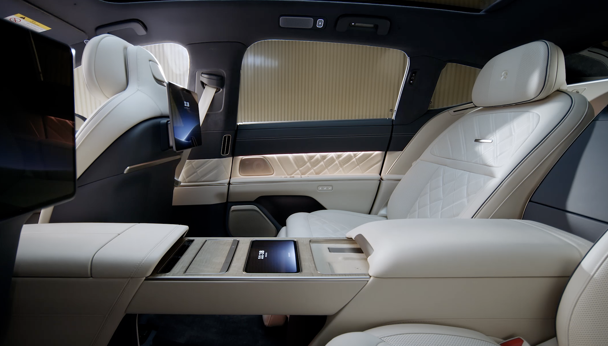 细节上看,大部分老板会在后排乘坐,ET9 预备了582mm 超宽座垫,后排 20 向电动调理。一键联动 11 项功用调理,最大躺角可达 135°。C柱三角窗隐私规划、全车隐私玻璃、七扇电动遮阳帘能够协助处理隐私问题,ARNC 高阶自动降噪使得其车内十分静寂。有一个人性化的可折叠百变行政桌,便利笔记本电脑工作等场景运用,一个电动开合智能冰箱,能够敷衍冷饮和热饮,后部还有一个8L 后排智能保险箱。音响系统也用的比较厚实,九天天琴 8.2.4.8 沉溺声系统,35 个扬声器,立异引进职业后排中置盘绕单元,头枕扬声器和双低音炮组合。